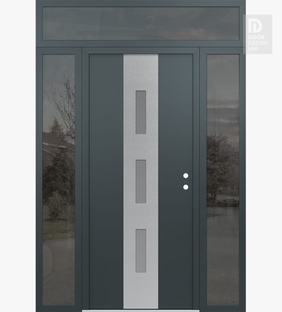 Modern Steel Front Door DIAMOND A7 60" X 96" ANTHRACITE/ANTHRACITE FROSTED GLASS PANEL STAINLESS STEEL RHI WITH 2 SIDELITES AND TRANSOM MIRRORED GLASS