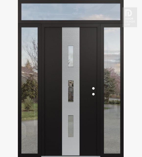 Modern Steel Front Door DIAMOND A7 60" X 96" BLACK/BLACK CLEAR GLASS PANEL STAINLESS STEEL RHI WITH 2 SIDELITES AND TRANSOM CLEAR GLASS