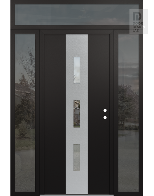 Modern Steel Front Door DIAMOND A7 60" X 96" BLACK/BLACK CLEAR GLASS PANEL STAINLESS STEEL RHI WITH 2 SIDELITES AND TRANSOM MIRRORED GLASS