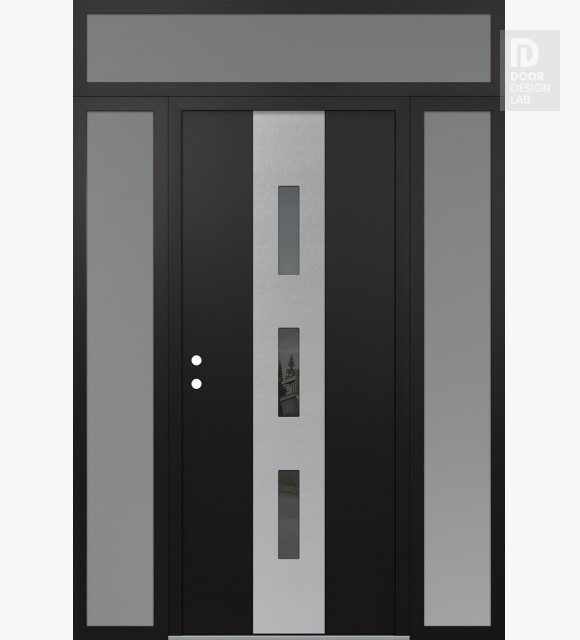 Modern Steel Front Door DIAMOND A7 60" X 96" BLACK/BLACK MIRRORED GLASS PANEL STAINLESS STEEL LHI WITH 2 SIDELITES AND TRANSOM FROSTED GLASS