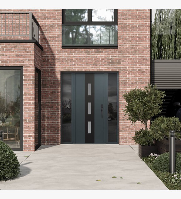 Modern Steel Front Door DIAMOND A7 64" X 80" ANTHRACITE/ANTHRACITE FROSTED GLASS PANEL BLACK LHI WITH 2 SIDELITES MIRRORED GLASS