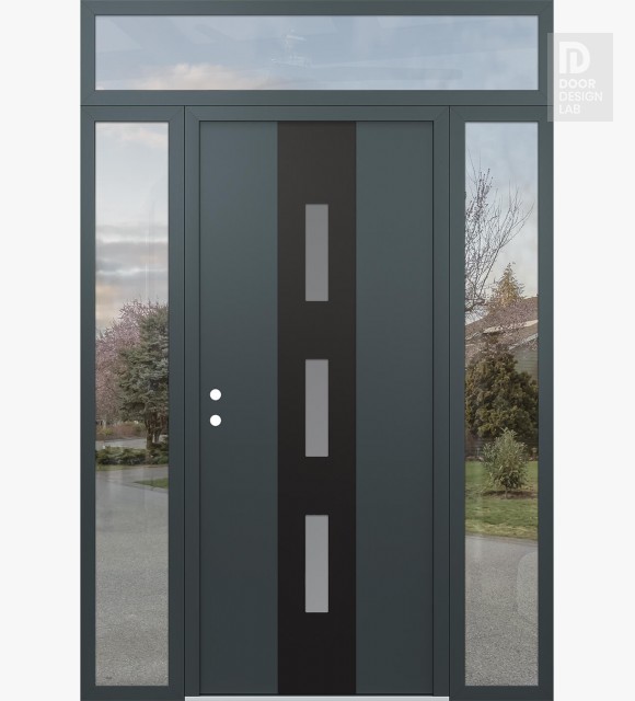 Modern Steel Front Door DIAMOND A7 64" X 96" ANTHRACITE/ANTHRACITE FROSTED GLASS PANEL BLACK LHI WITH 2 SIDELITES AND TRANSOM CLEAR GLASS