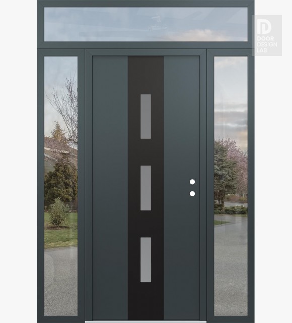 Modern Steel Front Door DIAMOND A7 64" X 96" ANTHRACITE/ANTHRACITE FROSTED GLASS PANEL BLACK RHI WITH 2 SIDELITES AND TRANSOM CLEAR GLASS