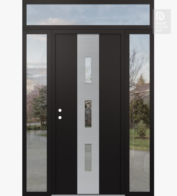 Modern Steel Front Door DIAMOND A7 64" X 96" BLACK/BLACK CLEAR GLASS PANEL STAINLESS STEEL LHI WITH 2 SIDELITES AND TRANSOM CLEAR GLASS