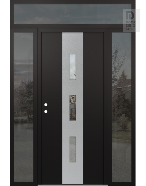 Modern Steel Front Door DIAMOND A7 64" X 96" BLACK/BLACK CLEAR GLASS PANEL STAINLESS STEEL LHI WITH 2 SIDELITES AND TRANSOM MIRRORED GLASS