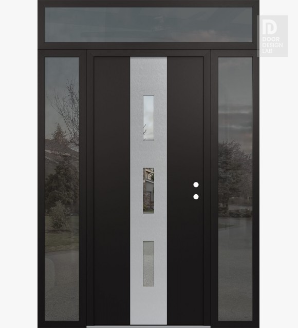 Modern Steel Front Door DIAMOND A7 64" X 96" BLACK/BLACK CLEAR GLASS PANEL STAINLESS STEEL RHI WITH 2 SIDELITES AND TRANSOM MIRRORED GLASS