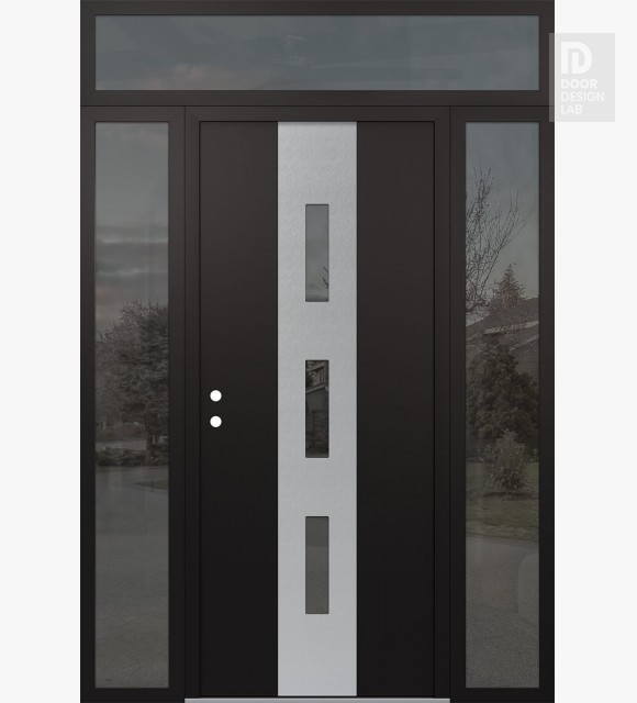 Modern Steel Front Door DIAMOND A7 64" X 96" BLACK/BLACK MIRRORED GLASS PANEL STAINLESS STEEL LHI WITH 2 SIDELITES AND TRANSOM MIRRORED GLASS