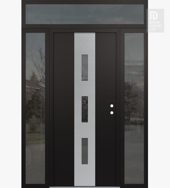 Modern Steel Front Door DIAMOND A7 64" X 96" BLACK/BLACK MIRRORED GLASS PANEL STAINLESS STEEL RHI WITH 2 SIDELITES AND TRANSOM MIRRORED GLASS