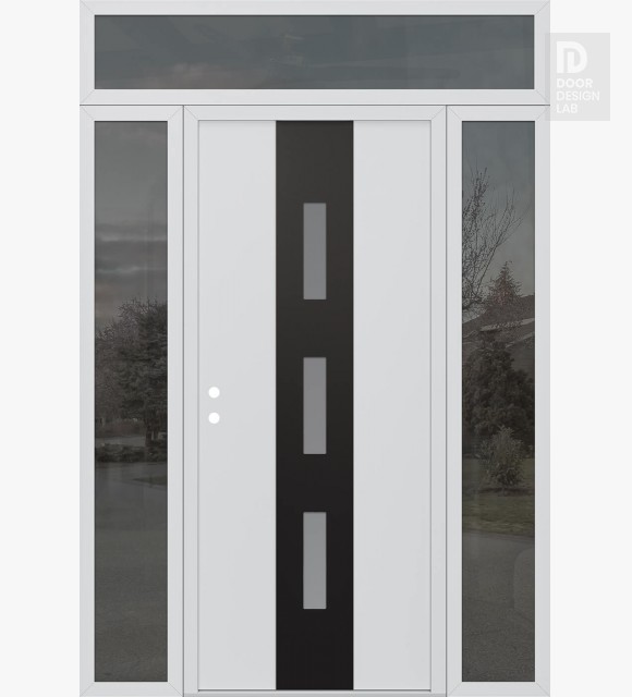 Modern Steel Front Door DIAMOND A7 64" X 96" BLACK/WHITE FROSTED GLASS PANEL BLACK LHI WITH 2 SIDELITES AND TRANSOM MIRRORED GLASS