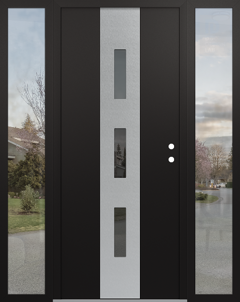 Modern Steel Front Door DIAMOND A7 68" X 80" BLACK/BLACK MIRRORED GLASS PANEL STAINLESS STEEL RHI WITH 2 SIDELITES CLEAR GLASS
