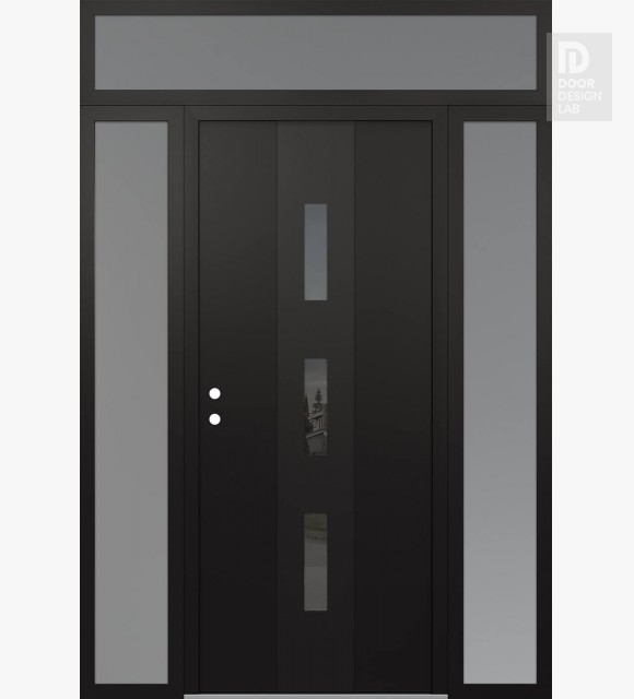 Modern Steel Front Door DIAMOND A7 68" X 96" BLACK/BLACK MIRRORED GLASS PANEL BLACK LHI WITH 2 SIDELITES AND TRANSOM FROSTED GLASS