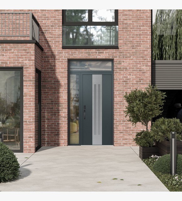 Modern Steel Front Door DIAMOND A8 48" X 96" ANTHRACITE/ANTHRACITE FROSTED GLASS PANEL STAINLESS STEEL RHI WITH SIDELITE AND TRANSOM CLEAR GLASS