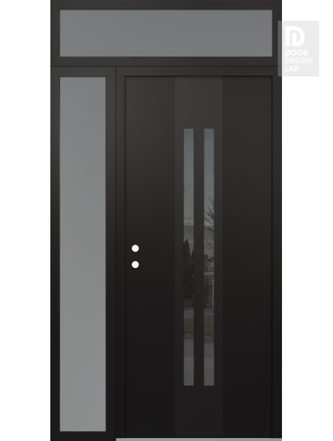 Modern Steel Front Door DIAMOND A8 50" X 96" BLACK/BLACK MIRRORED GLASS PANEL BLACK LHI WITH SIDELITE AND TRANSOM FROSTED GLASS