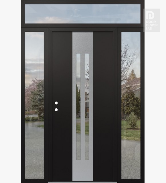 Modern Steel Front Door DIAMOND A8 60" X 96" BLACK/BLACK CLEAR GLASS PANEL STAINLESS STEEL LHI WITH 2 SIDELITES AND TRANSOM CLEAR GLASS