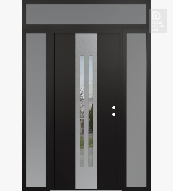 Modern Steel Front Door DIAMOND A8 60" X 96" BLACK/BLACK CLEAR GLASS PANEL STAINLESS STEEL RHI WITH 2 SIDELITES AND TRANSOM FROSTED GLASS