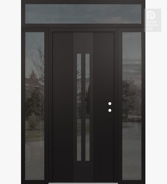 Modern Steel Front Door DIAMOND A8 60" X 96" BLACK/BLACK MIRRORED GLASS PANEL BLACK RHI WITH 2 SIDELITES AND TRANSOM MIRRORED GLASS