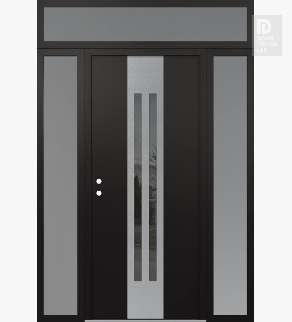 Modern Steel Front Door DIAMOND A8 60" X 96" BLACK/BLACK MIRRORED GLASS PANEL STAINLESS STEEL LHI WITH 2 SIDELITES AND TRANSOM FROSTED GLASS