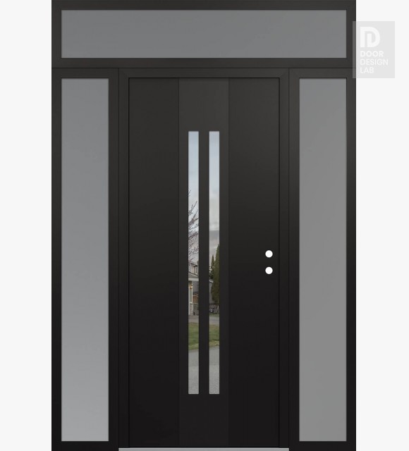 Modern Steel Front Door DIAMOND A8 64" X 96" BLACK/BLACK CLEAR GLASS PANEL BLACK RHI WITH 2 SIDELITES AND TRANSOM FROSTED GLASS