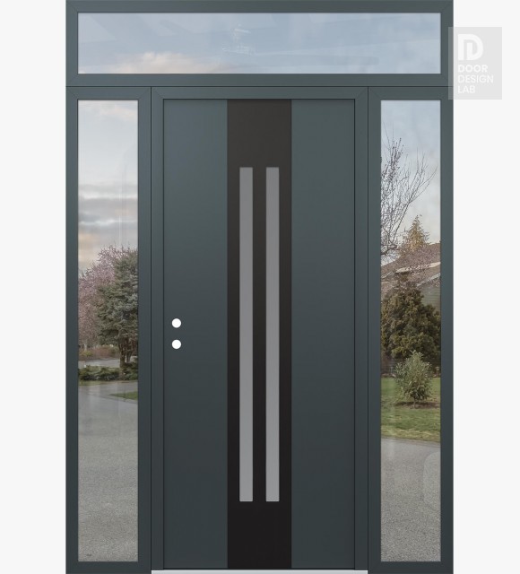 Modern Steel Front Door DIAMOND A8 68" X 96" ANTHRACITE/ANTHRACITE FROSTED GLASS PANEL BLACK LHI WITH 2 SIDELITES AND TRANSOM CLEAR GLASS