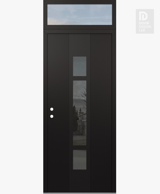 Modern Steel Front Door DIAMOND A9 36" X 96" BLACK/BLACK MIRRORED GLASS PANEL BLACK LHI WITH TRANSOM CLEAR GLASS