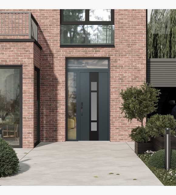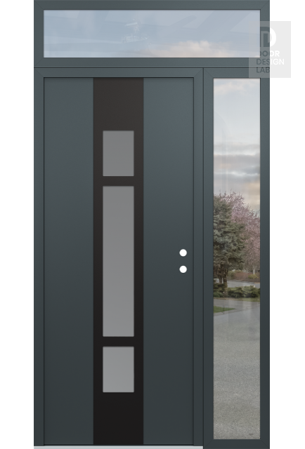 Modern Steel Front Door DIAMOND A9 48" X 96" ANTHRACITE/ANTHRACITE FROSTED GLASS PANEL BLACK RHI WITH SIDELITE AND TRANSOM CLEAR GLASS