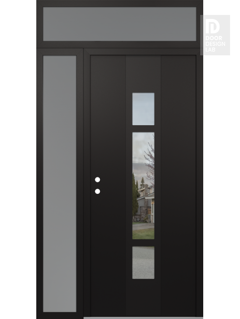 Modern Steel Front Door DIAMOND A9 48" X 96" BLACK/BLACK CLEAR GLASS PANEL BLACK LHI WITH SIDELITE AND TRANSOM FROSTED GLASS