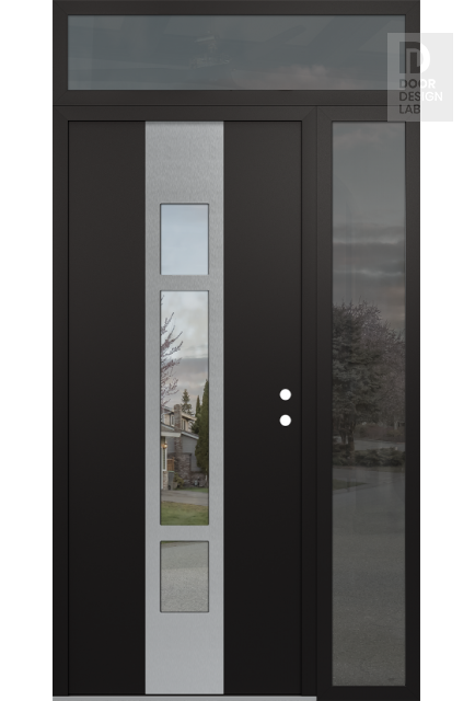 Modern Steel Front Door DIAMOND A9 48" X 96" BLACK/BLACK CLEAR GLASS PANEL STAINLESS STEEL RHI WITH SIDELITE AND TRANSOM MIRRORED GLASS