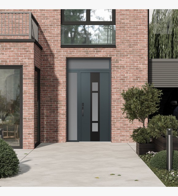 Modern Steel Front Door DIAMOND A9 50" X 96" ANTHRACITE/ANTHRACITE FROSTED GLASS PANEL BLACK RHI WITH SIDELITE AND TRANSOM FROSTED GLASS