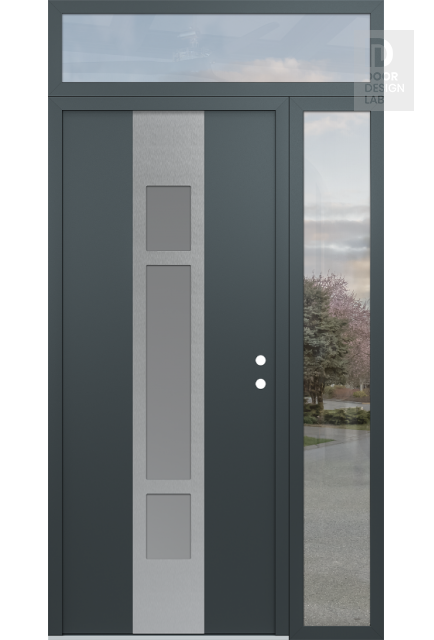 Modern Steel Front Door DIAMOND A9 52" X 96" ANTHRACITE/ANTHRACITE FROSTED GLASS PANEL STAINLESS STEEL RHI WITH SIDELITE AND TRANSOM CLEAR GLASS