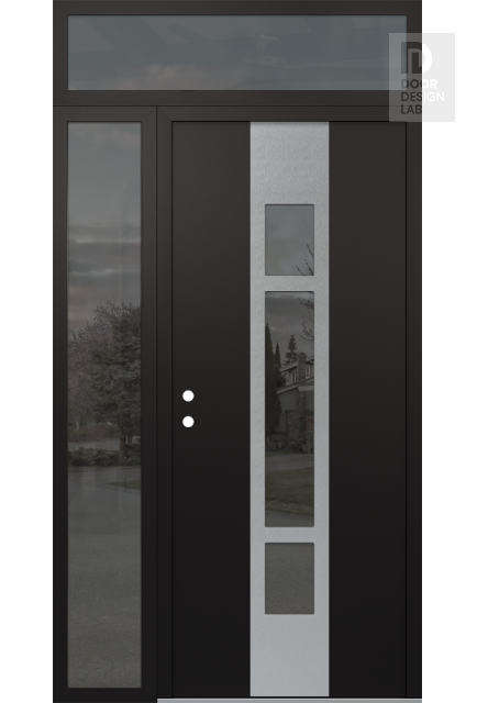 Modern Steel Front Door DIAMOND A9 52" X 96" BLACK/BLACK MIRRORED GLASS PANEL STAINLESS STEEL LHI WITH SIDELITE AND TRANSOM MIRRORED GLASS