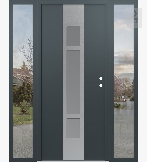 Modern Steel Front Door DIAMOND A9 60" X 80" ANTHRACITE/ANTHRACITE FROSTED GLASS PANEL STAINLESS STEEL RHI WITH 2 SIDELITES CLEAR GLASS