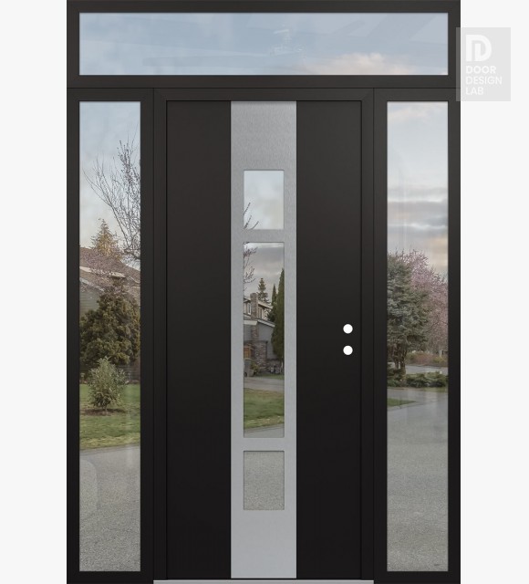 Modern Steel Front Door DIAMOND A9 60" X 96" BLACK/BLACK CLEAR GLASS PANEL STAINLESS STEEL RHI WITH 2 SIDELITES AND TRANSOM CLEAR GLASS