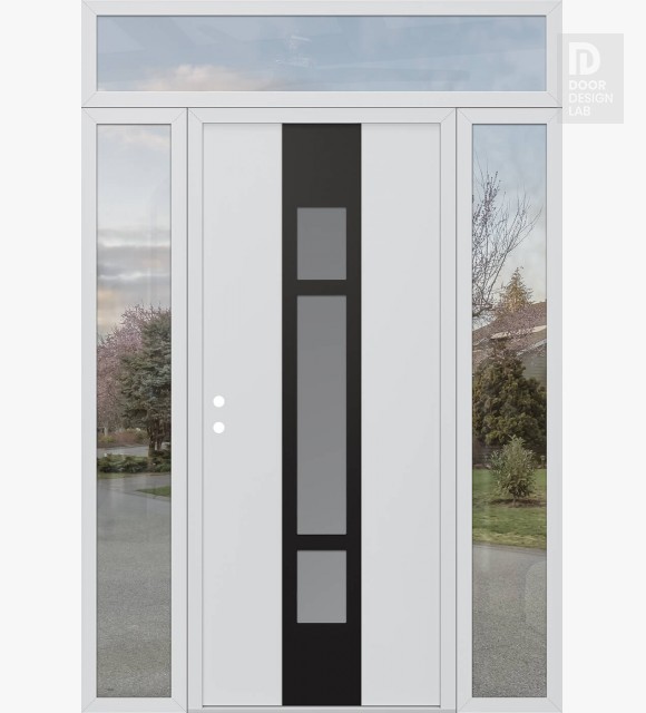 Modern Steel Front Door DIAMOND A9 60" X 96" BLACK/WHITE FROSTED GLASS PANEL BLACK LHI WITH 2 SIDELITES AND TRANSOM CLEAR GLASS