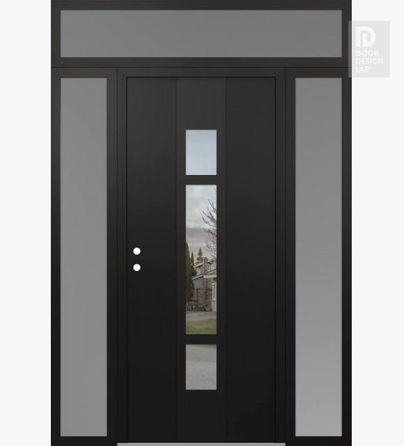 Modern Steel Front Door DIAMOND A9 64" X 96" BLACK/BLACK CLEAR GLASS PANEL BLACK LHI WITH 2 SIDELITES AND TRANSOM FROSTED GLASS