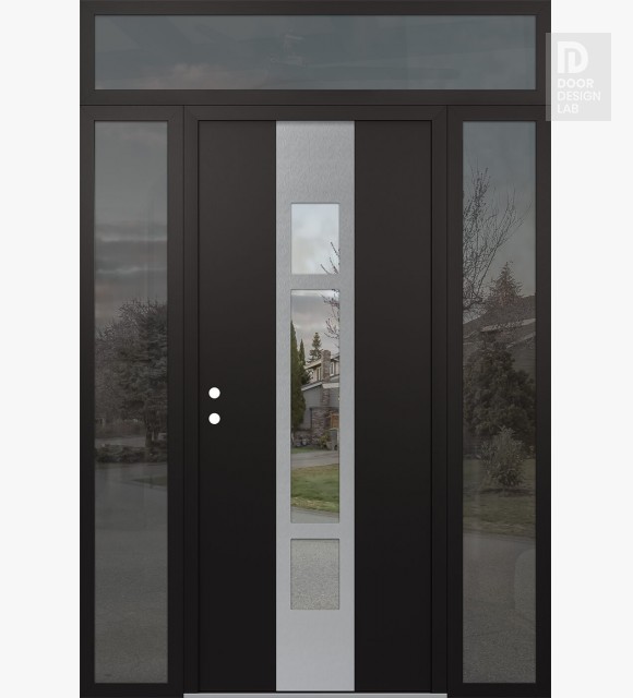 Modern Steel Front Door DIAMOND A9 64" X 96" BLACK/BLACK CLEAR GLASS PANEL STAINLESS STEEL LHI WITH 2 SIDELITES AND TRANSOM MIRRORED GLASS