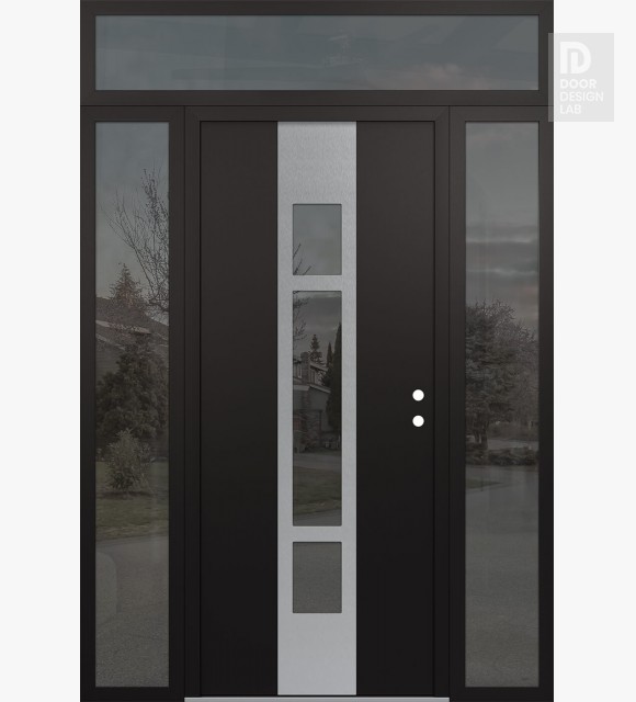 Modern Steel Front Door DIAMOND A9 64" X 96" BLACK/BLACK MIRRORED GLASS PANEL STAINLESS STEEL RHI WITH 2 SIDELITES AND TRANSOM MIRRORED GLASS