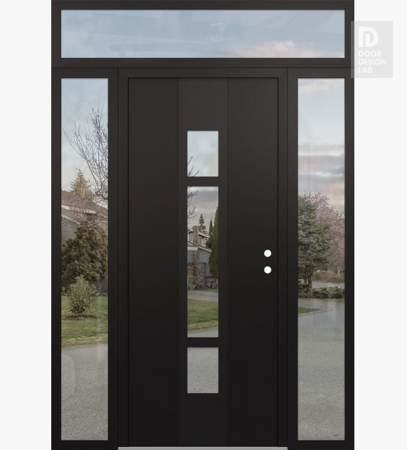 Modern Steel Front Door DIAMOND A9 68" X 96" BLACK/BLACK CLEAR GLASS PANEL BLACK RHI WITH 2 SIDELITES AND TRANSOM CLEAR GLASS