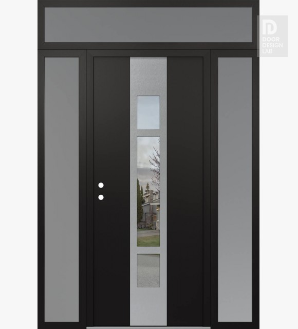 Modern Steel Front Door DIAMOND A9 68" X 96" BLACK/BLACK CLEAR GLASS PANEL STAINLESS STEEL LHI WITH 2 SIDELITES AND TRANSOM FROSTED GLASS