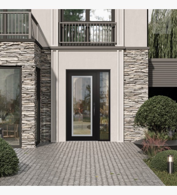 The door unit kit includes one sidelite, a decorative stationary section installed to the left or right of the exterior door.