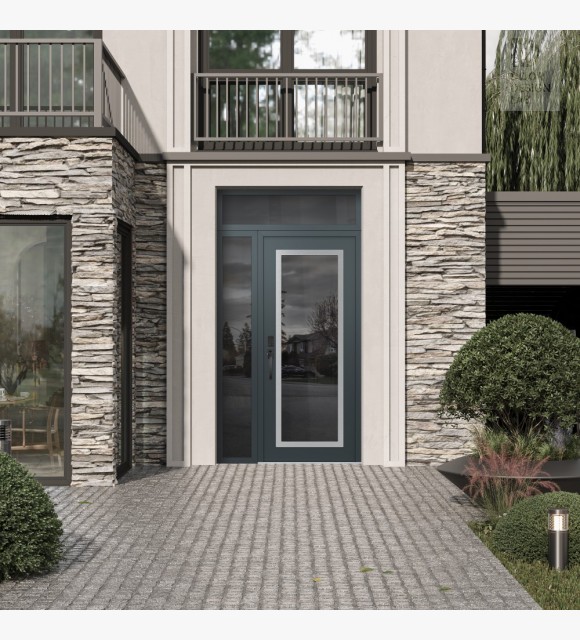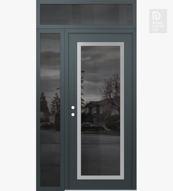 Modern Steel Front Door Diamond C1 52" x 96" anthracite/anthracite mirrored Glass Panel stainless steel RHI with Sidelite and Transom mirrored Glass