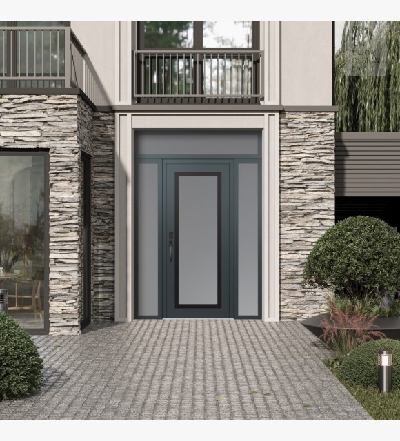 Modern Steel Front Door Diamond C1 60" x 96" anthracite/anthracite frosted Glass Panel black RHI with 2 Sidelites and Transom frosted Glass