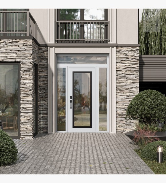 The door unit kit includes a transom and two sidelites, which are decorative stationary sections installed above, to the left and to the right of the exterior door.