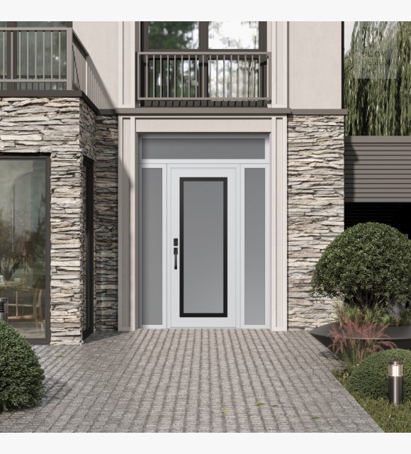 The door unit kit includes a transom and two sidelites, which are decorative stationary sections installed above, to the left and to the right of the exterior door.