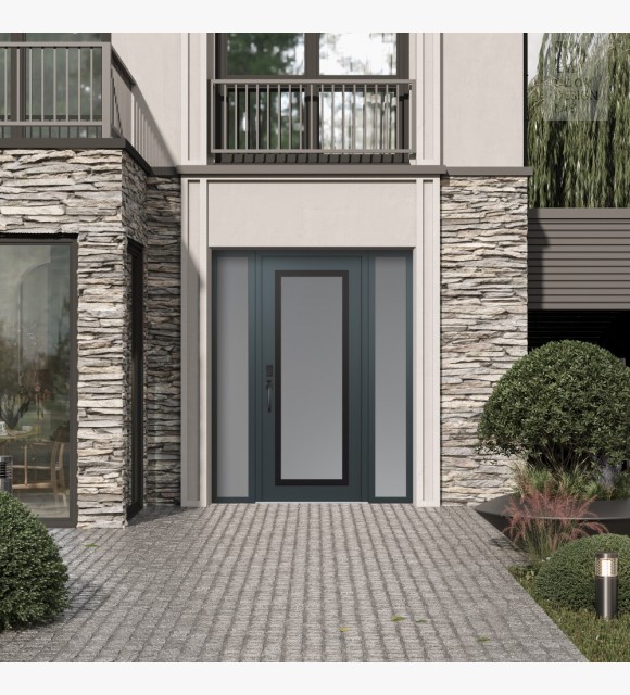 Modern Steel Front Door Diamond C1 68" x 80" anthracite/anthracite frosted Glass Panel black RHI with 2 Sidelites frosted Glass