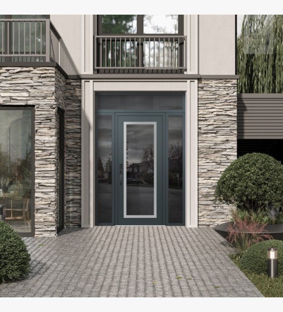 Modern Steel Front Door Diamond C1 68" x 96" anthracite/anthracite mirrored Glass Panel stainless steel RHI with 2 Sidelites and Transom mirrored Glass