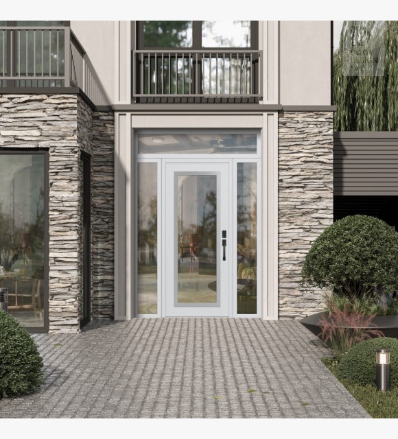The door unit kit includes a transom and two sidelites, which are decorative stationary sections installed above, to the left and to the right of the exterior door.