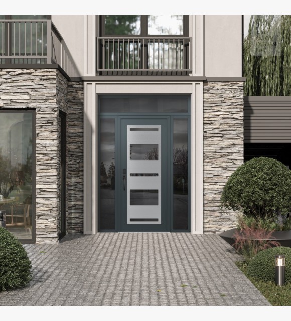 Modern Steel Front Door Diamond C10 60" x 96" anthracite/anthracite mirrored Glass Panel stainless steel RHI with 2 Sidelites and Transom mirrored Glass