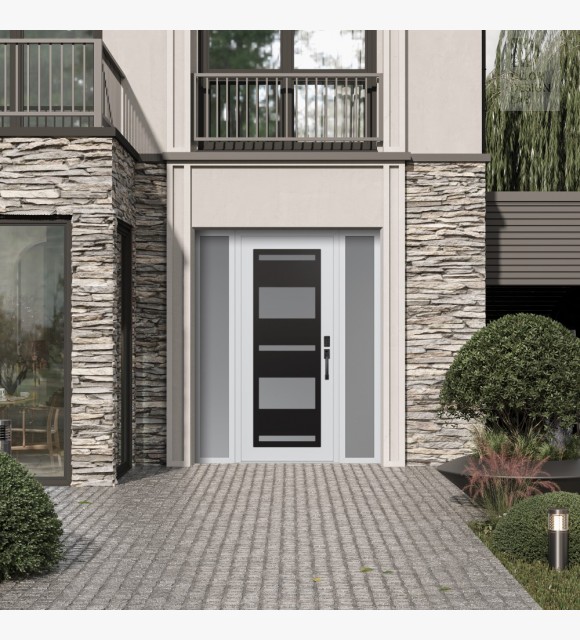 Modern Steel Front Door Diamond C10 68" x 80" white/white frosted Glass Panel black LHI with 2 Sidelites frosted Glass