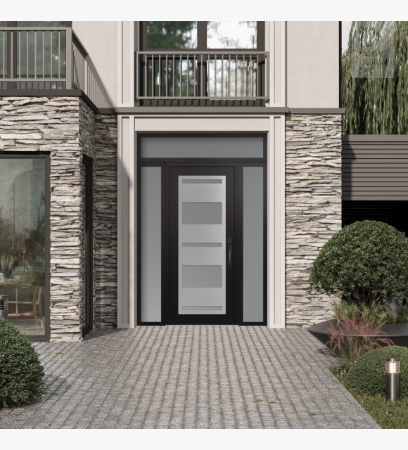 Modern Steel Front Door Diamond C10 68" x 96" black/white frosted Glass Panel stainless steel LHI with 2 Sidelites and Transom frosted Glass