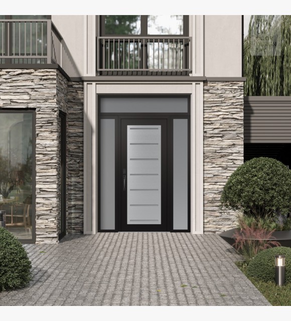 Modern Steel Front Door Diamond C11 60" x 96" black/white frosted Glass Panel stainless steel RHI with 2 Sidelites and Transom frosted Glass